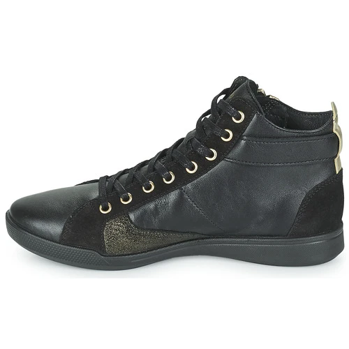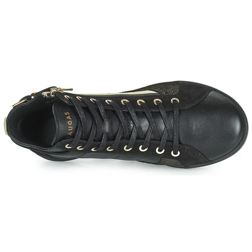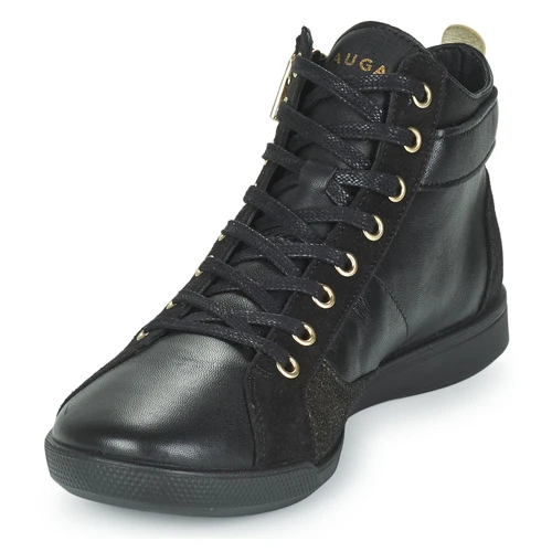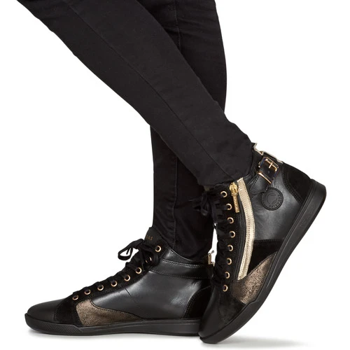 Pataugas heeft een comfortabele en trendy hoge sneaker ontworpen. De rundleer schacht in de kleur zwart is sportief vormgegeven. Heel hip! Het model Palme Mix heeft een leren binnenvoering en een synthetische buitenzool. Dit model wordt zonder twijfel het icoon van deze collectie.